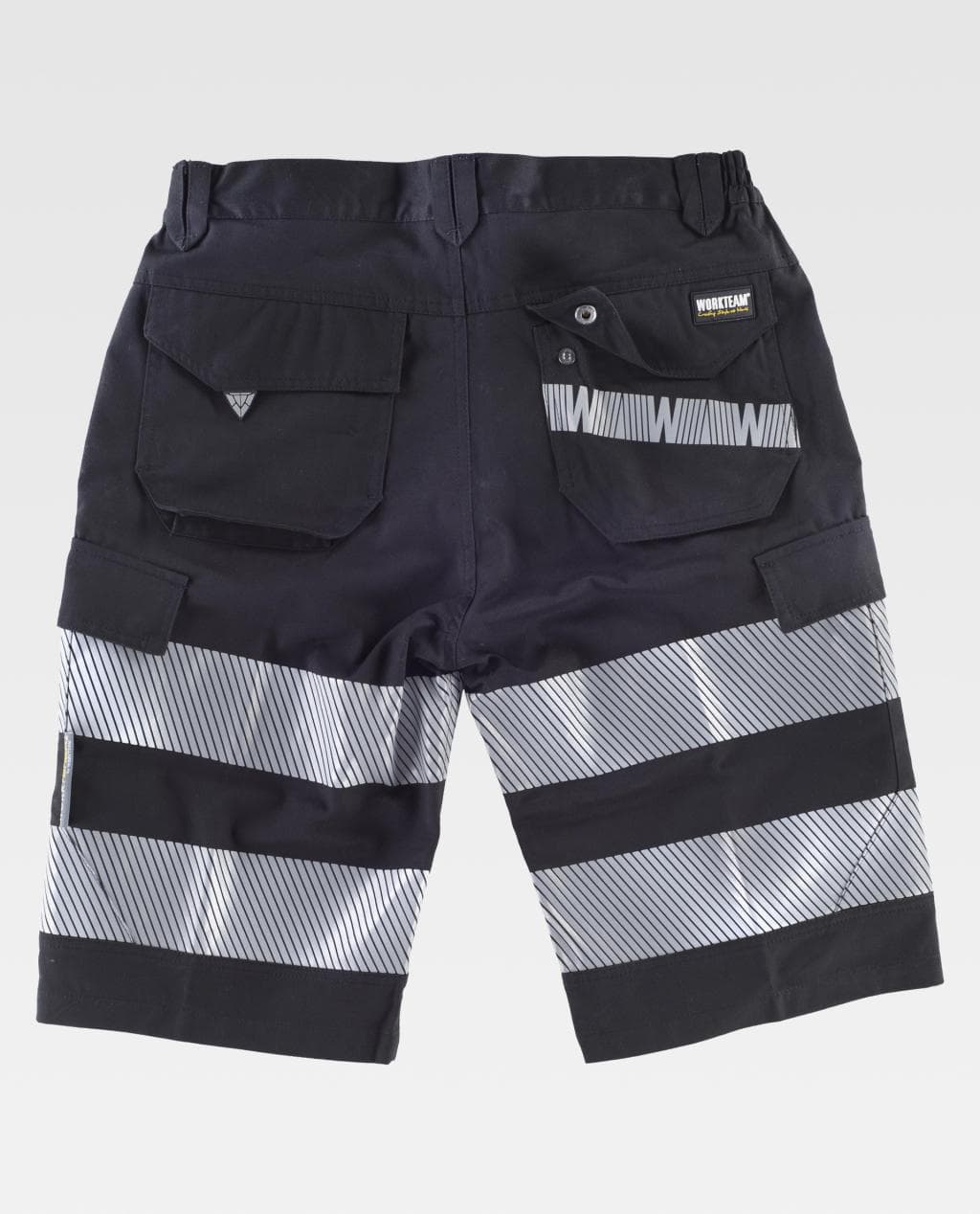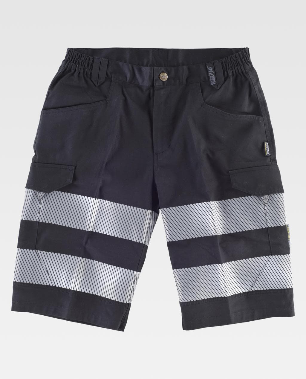 Bermuda con cintas reflectantes segmentadas. Dos bolsos de abertura inclinada en los costados, dos bolsos laterales interiores con cartera de corchete oculto. Dos bolsos traseros con pliegue inferior con cartera de corchete oculto. Dos cintas reflectantes segmentadas termoadhesivas en perneras. Cinta decorativa personalizada en un bolso trasero. Elástico en los laterales de la cintura. Cierre de botón metálico y bragueta de cremallera.